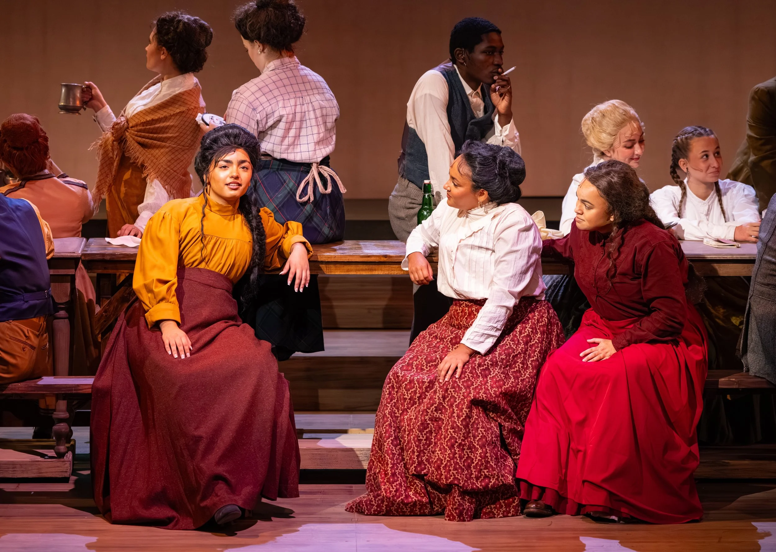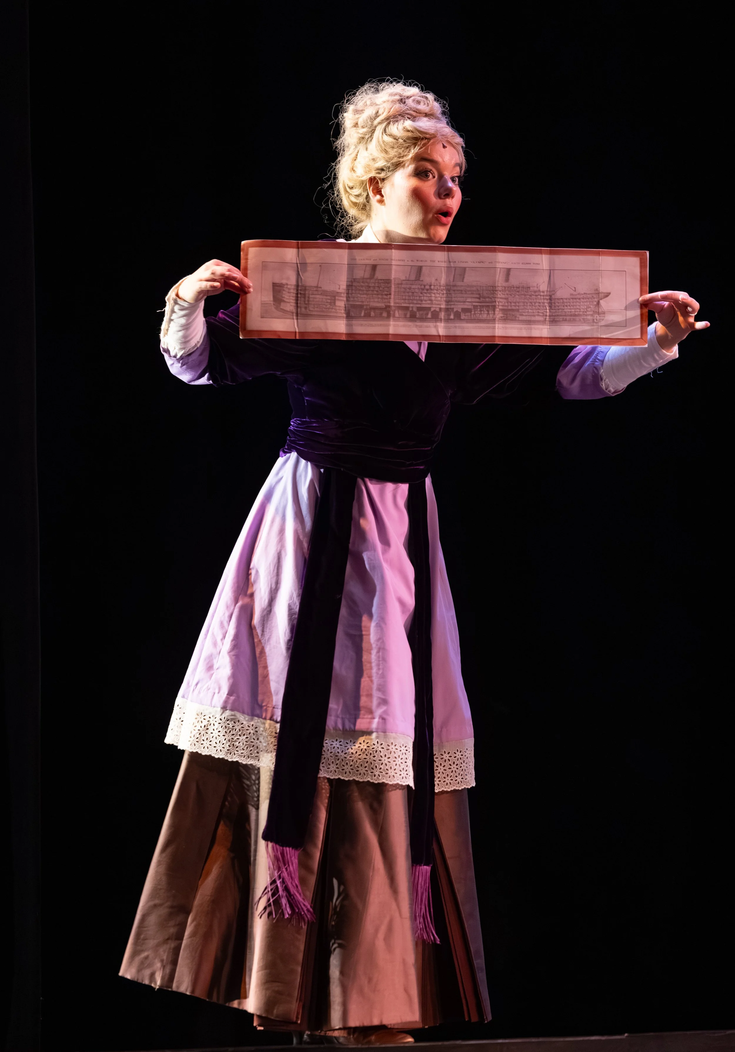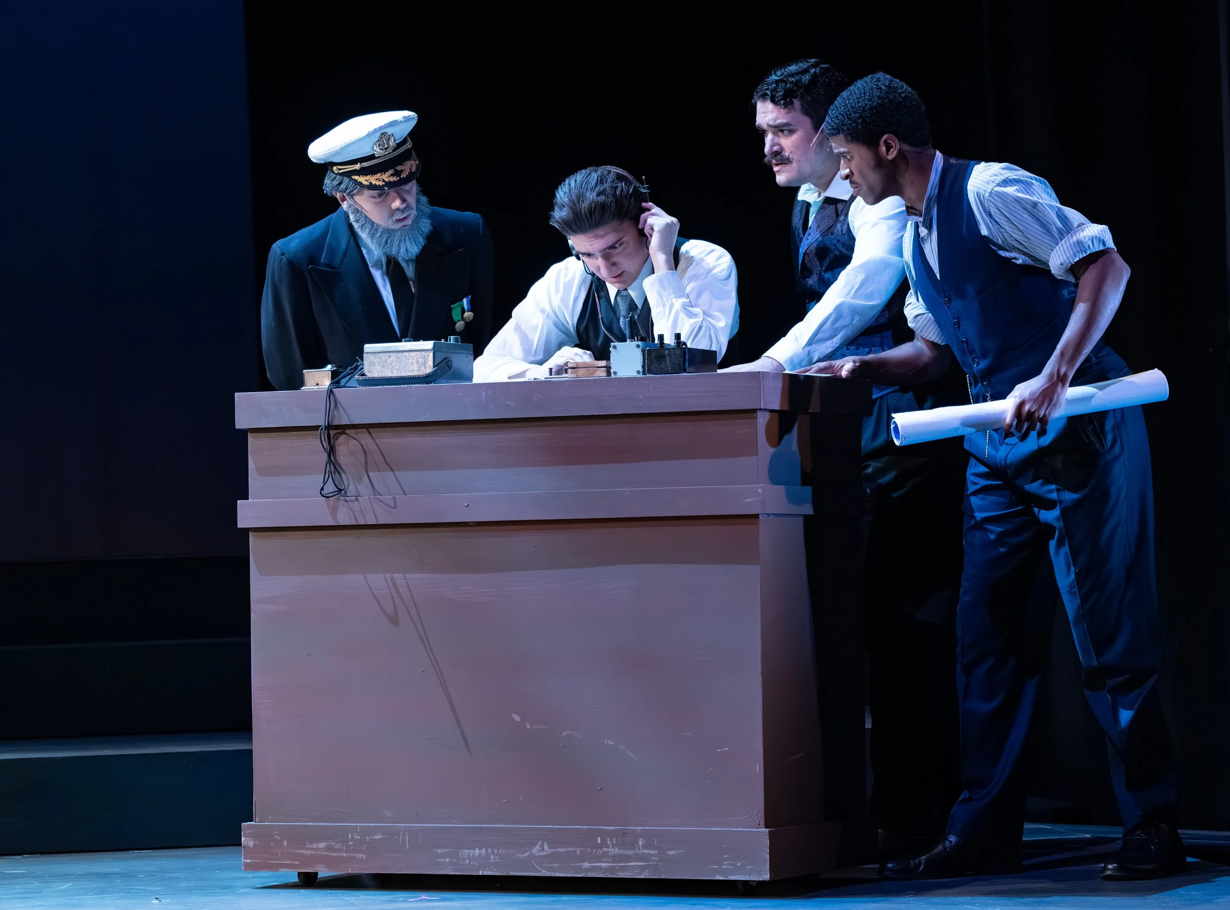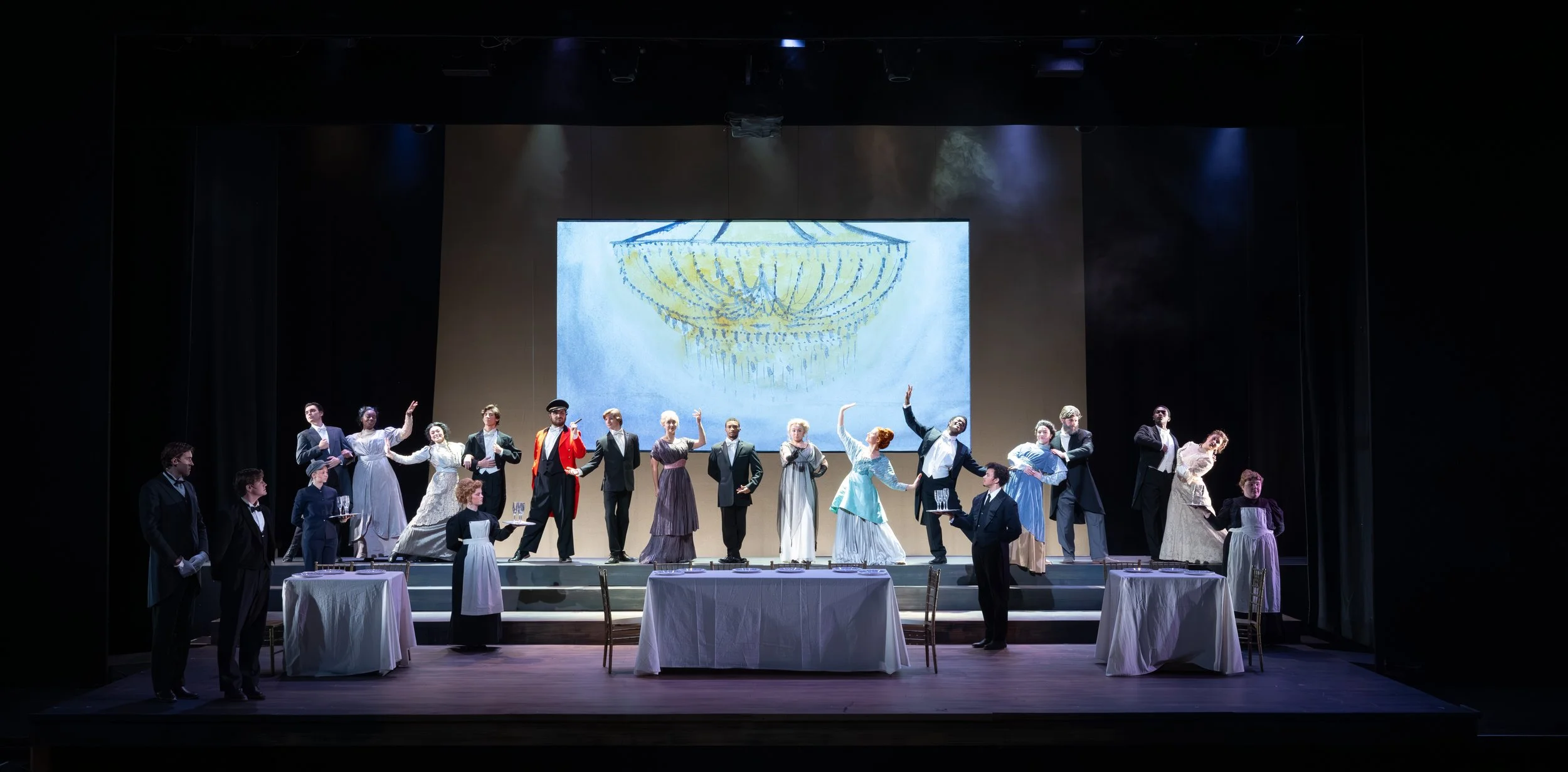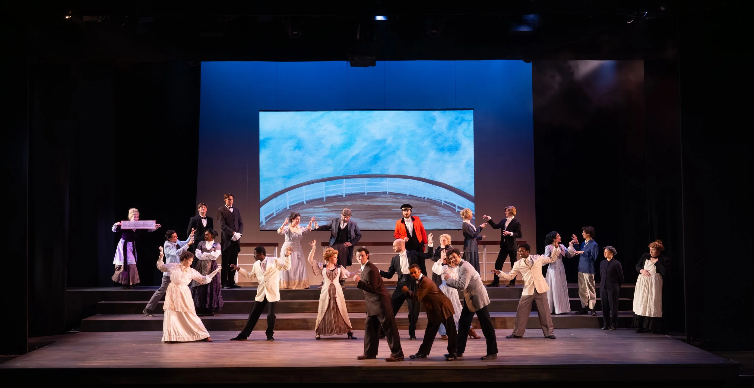 A sense of heightened reality and dreamlike grandeur, reflecting the passengers’ awe of the Titanic while staying true to its period. A modernist approach shapes the visuals, with color temperature subtly distinguishing social classes. In the second act, sharp angles and shifting contrasts echo the ship’s sinking, heightening tension and instability. Throughout, close collaboration with projections creates a cohesive, immersive world where light and imagery work together to support mood, story, and atmosphere.